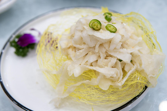 第二道菜是隋堤柳芽。古代人喜欢品尝野菜,鲜嫩的柳芽也当作了菜肴。柳芽入口即化,嚼头十足。伴着雪白的豆腐,用特色酱汁搅拌,口味特别,难以忘记。