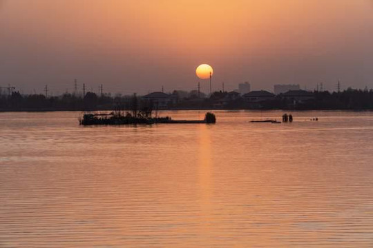 秋风瑟瑟,故道被落日余晖洗染。一片金黄。忽然听到鸟叫,抬头望去,数百只鸟儿暮色中飞来。落霞与孤鹜齐飞,秋水共长天一色。天地之间,一片通红。水色茫茫,天空苍苍。浩渺万千,心绪翻涌。故道的沧桑寂寞之感扑面而来。