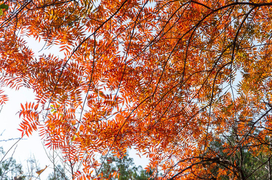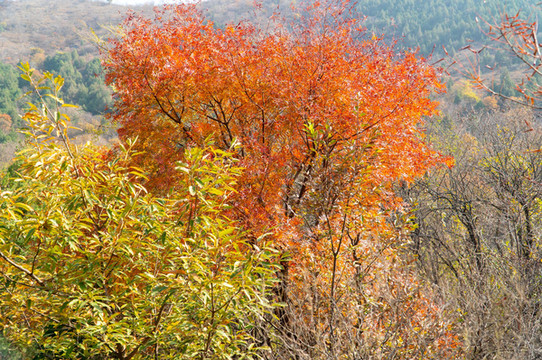 山顶火红烂漫,树叶金黄,天空碧蓝。如此应景,大家都兴奋不已。秋天时节,空气凉透。穿着风衣,吹着清风,只觉天高云阔,云蒸霞蔚。景色美不胜收,游客流连忘返。一片片阔叶林跃然眼前,皖北大地上,这里是最美的山川风景。