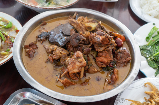通向皇藏峪带有入口的是一条长长的上坡,道路的两边不乏卖木质雕刻品的小摊,小吃车,以及饭店。若要问道来皇藏峪,有什么著名特色的吃食,那一定便是小鸡炖蘑菇了。