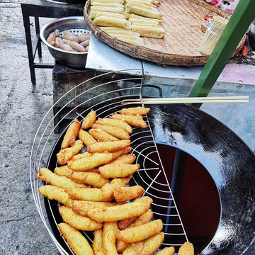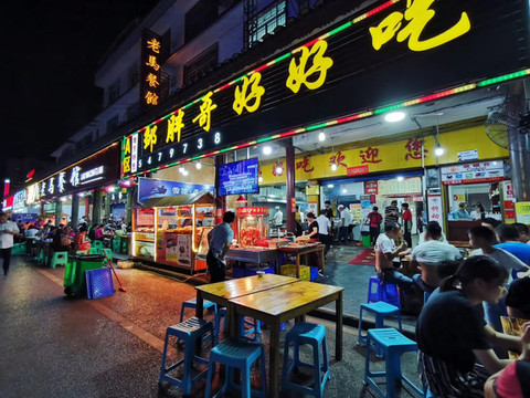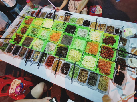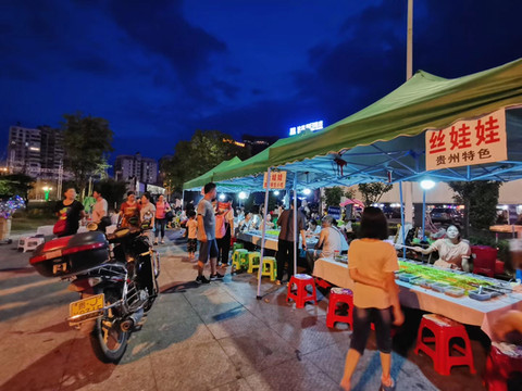 晚上住荔波,逛吃荔波美食街。他们摆摊喝冰粉,吃丝娃娃,太有趣了。一边广场还有各大舞团在BATTLE,烧烤摊都在放土嗨,浓浓的生活气息,真好。 夜市里的都是硬菜,感觉都很好吃啊。我们晚餐吃邹胖哥,来到夜市很好找,门面足足有三个区域的最多人的就是他们家。点了烤排骨和烧猪双拼,沾上辣椒面,很好吃!!这边的酸汤,蘸料和辣椒面真的百搭。蕨菜就是中规中矩的青菜,牙签牛肉呢,很辣又吃到停不下来。主菜豆花烤鱼,大家都第一次吃这个,都被惊艳到了,为什么这两种东西会搭配到一起啊?而且会这么好吃,嫩滑的豆花,鲜美的鱼,“荔波”在苗语里的意思是美丽的水,可能因为美丽的水才能孕育出好吃的鱼吧。(并不是)