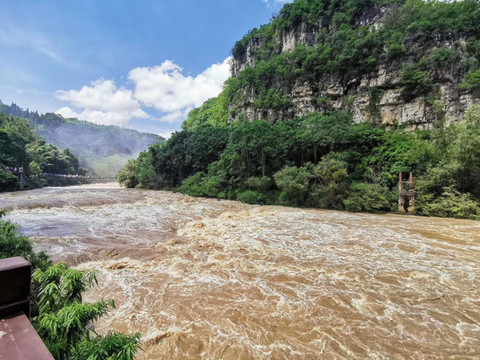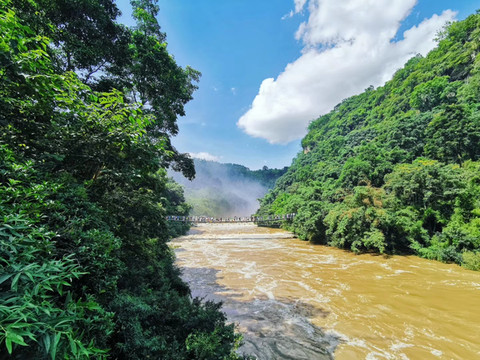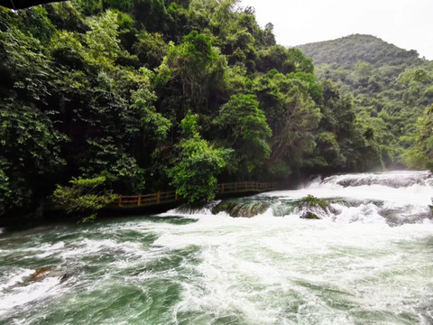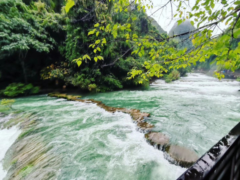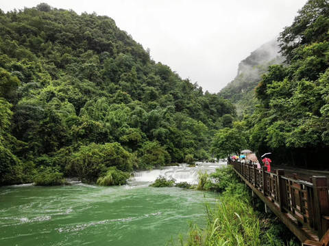 从小七孔古桥过来,一路拾级而上,一边是轰鸣而下的68级跌水瀑布,一边是雨后烟雾弥漫静谧的一座座大山,这是全程我最喜欢的一段。