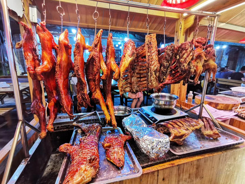 晚上苗寨夜市逛吃逛吃,我们在粉店吃粉,看到老板在边斗地主边吃烧烤,就问他哪家烧烤好吃,他说没名字的,然后放下正在斗地主的手机,说带我们去。我急忙说不用了不用了,等下该你吃牌了,他笑着说没事没事,就带我们去了。哇,也太NICE了吧?就这个!烤黑猪肉,真的好吃,还有那个烧饼,也很好吃,梅菜肉馅的。买银器我们不会看,就买了些小东西和牛角梳,推荐牛魔王家的,还可以刻字。