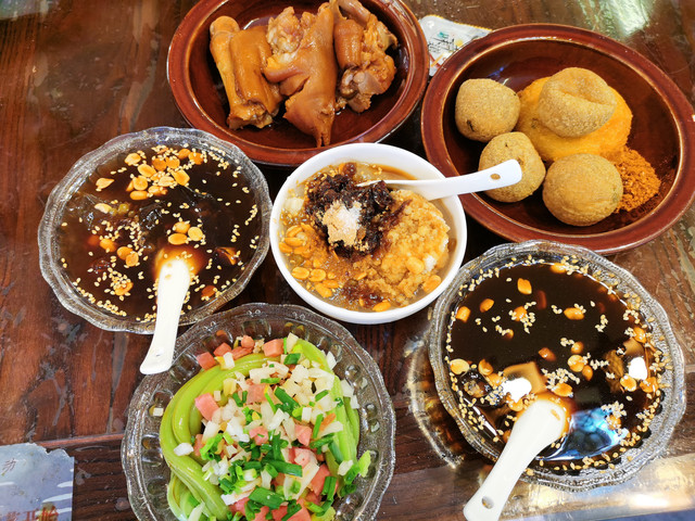 甲秀楼马路对面就是贵阳非常有名的包整贵州小吃研究中心,寓意是包含了整个贵州的小吃,岂能错过?我们点了著名的丝娃娃,茅台酱油火焰饭,老贵阳豆腐圆子,还有六盘水三年陈生吃火腿,毛尖啤酒和豆花水果圆子。价格不贵,菜量又大,本来是想先点几样菜填填肚子,然后再点第二轮的,结果点完第一轮就没有第二轮啦!由于今天是中秋节,商家还送了一个凤梨月饼,另外还有两份中秋节的小零食礼包,真的是不给好评都不行啊!