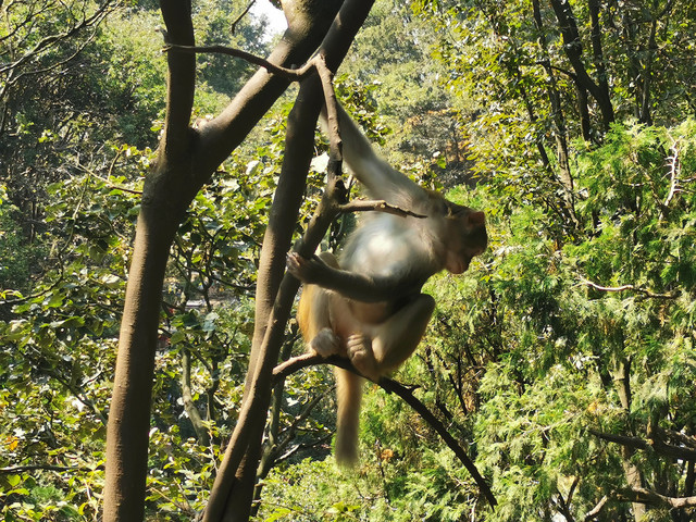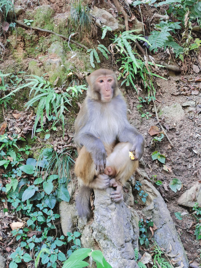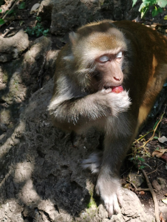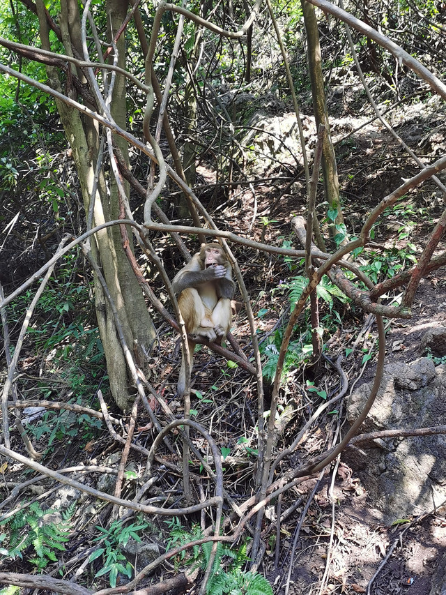 说来黔灵山公园的门票还真是便宜,只要五块钱,可以看到各种各样的动物以及大熊猫,竟然还有垂耳兔。不过,这些都是关在笼子里的动物,最有趣的还是猴子了。猴子真的是不怕人,随意的就走到街道上。抢游人的矿泉水瓶子。许多游客特地带了一大袋香蕉过来喂猴子吃,每次给猴子一根香蕉,猴子就会当场表演剥香蕉,也有游客给猴子吃核桃的。我们昨天在天眼买了一大袋爆米花吃不完,所以就带过来给猴子吃。但是猴子竟然嫌弃爆米花是垃圾食品,于是在小磨楚厨给他爆米花的时候还打了小魔厨一拳,根本就不吃!我们另外还带了几个李子,李子又酸又硬,也不确定猴子会不会要吃。结果我们把李子放在手心上递给猴子,猴子就很温柔的从我们手里接过李子吃起来,还很配合地和我们合影拍照,这里的猴子真的是都已经成精啦!