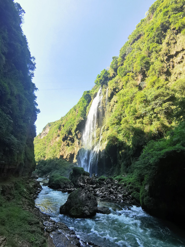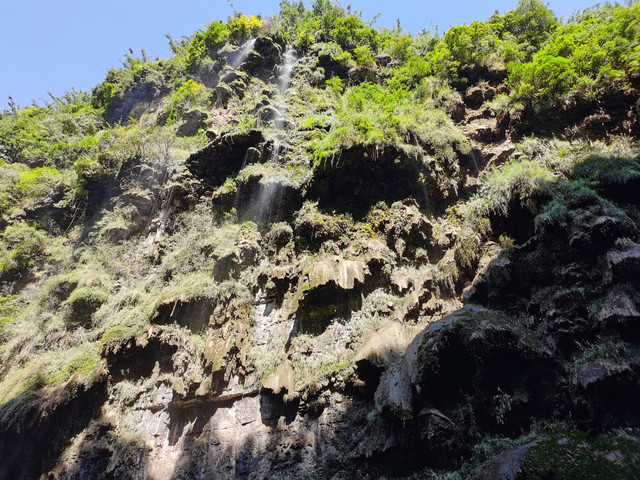 马岭河峡谷最好看的当然是峡谷了。峡谷非常的深,底下还有急流而下的清澈潺潺溪水。马岭河峡谷的瀑布不大,却和其他地方不一样。有许多小瀑布,星星点点的从山上流下来,形成一个又一个半圆形的岩石,像是在悬崖峭壁上,撑着一张张小伞,据说这是2.5亿年前形成的岩石。峡谷和泉水是那样的清幽,让人感受到大气而从容,像极了武侠小说里仙风道骨的世外高人修炼的地方。这峡谷那么深,岩石峭壁,不是一般的轻功,自然是上不去下不来的。