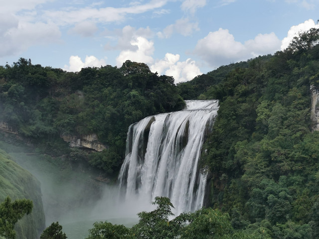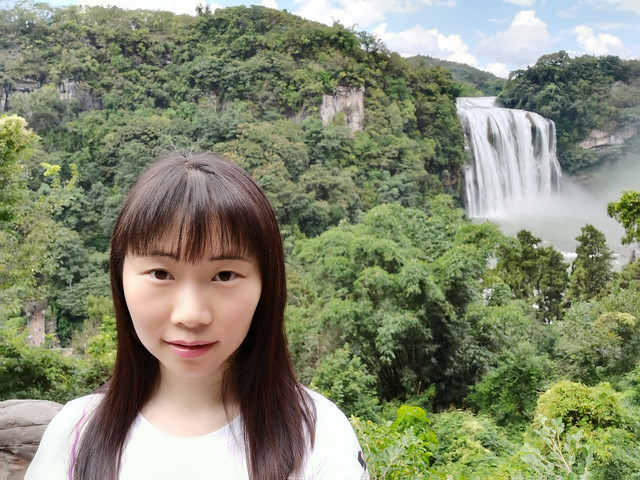 由于人少午餐让我们自己解决,吃了黄果树门口的肯德基,味道一般般。下午先去黄果树瀑布,黄果树瀑布很高大,但是并没有想象中那么美。可以绕到瀑布后面,穿越水帘洞还是比较有意思,水有点大,建议穿雨衣,雨鞋就没必要了。黄果树瀑布共有上中下三个观景台。中间位置的观景台拍照效果是最好的。上方拍不出来,下方的观景台像是在下雨,头都淋湿了,头发粘在一起,怎么能拍出好看的样子呢?这边需要插播一下,黄果树这里有许多卖水果的,我们买了水果地瓜,非常的好吃,是帮我们削好的,其他还有乌梅橘子之类的。另外,我们还看到像番茄一样大的无花果,价格不贵,十块钱一斤,但是一点都不甜,而且里边都是虫子,有的还发霉了。