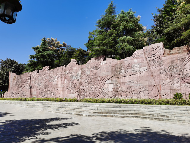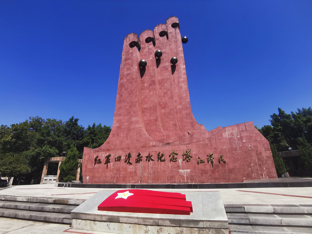出了纪念馆再往上走,便到了山顶。山顶上有四渡赤水纪念碑,在这里可以从更高角度看茅台镇,但是被树木遮挡了一部分。
