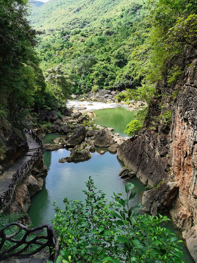 不同于万峰林景区的舒适,马岭河峡谷基本全程都要靠走,途中只有一个电梯,可以省掉上下山谷爬台阶。然而,除此以外还是有许多台阶要走,全程需要走一个半小时而且都是上上下下的比较累。看到有许多老年旅游团的人,撑着拐杖在走,真是替他们捏把汗,最后发现他们也就走到1/3的路程就返回了。
