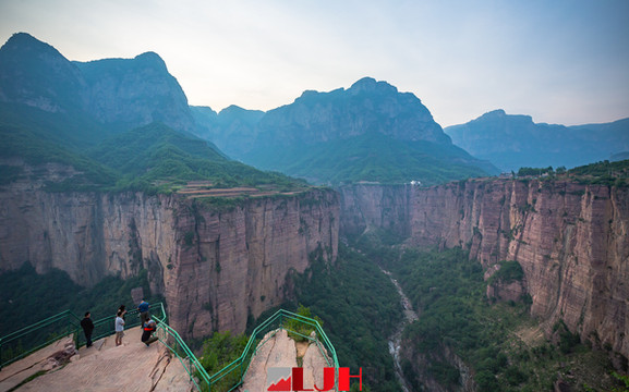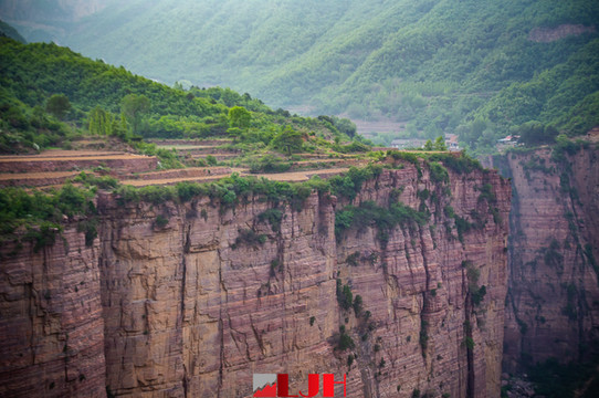而在锡崖沟村看红岩大峡谷,会给人一种震撼。村子的边上,沿着峡谷数百米高的峭壁上,新修了两座观景台,站在观景台上,可以正面对着红岩大峡谷的山谷口,低头可以探视谷底,抬头注目伟岸的峭壁。感觉太行山到了在这里,被一种神奇的力量劈成两半,硬生生从崇山峻岭中“撕开”一条裂缝出来。