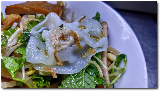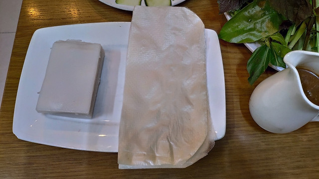 套餐形式,没有太多选择,端上来:一碗肉(有热汤)、一盘春卷、一盘米粉、一盘杂菜。要趁热将菜泡在热汤里,否则你只能生吃这些菜了,卖相不怎么样,可吃起来口感还不错。