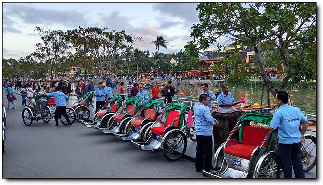 半天时间过得很快,第一天不想玩得太累,游玩过程中,还留意收集回程(返岘港)的交通信息:①酒店预订包车要350K越南盾,比来的时候便宜了近150K;②古城内一家旅行社的中巴,110K越南盾/人,需要到该门店上车;③市区一家私营巴士站,无空调的巴士,20K越南盾/人,行李每件按一人算;④古城另一家旅行社,私家车一辆250K越南盾(比来的时候便宜了一半),可以到乘客的酒店接人。对比之下,选择了第四方案,下单付款。