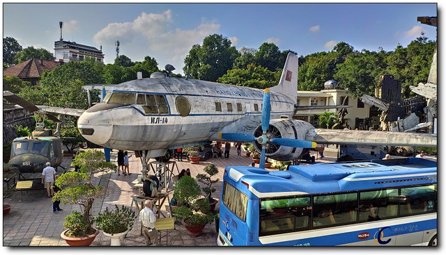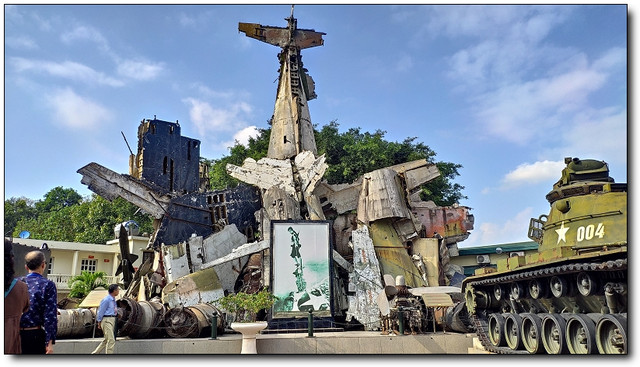 其中最特别的,就是空地中央一大堆法国制飞机残骸和美国制飞机F111的废铁之上,有一架前苏联制的米格21战斗机,寓意着奠边府战役中越南胜利击落美机的事迹。