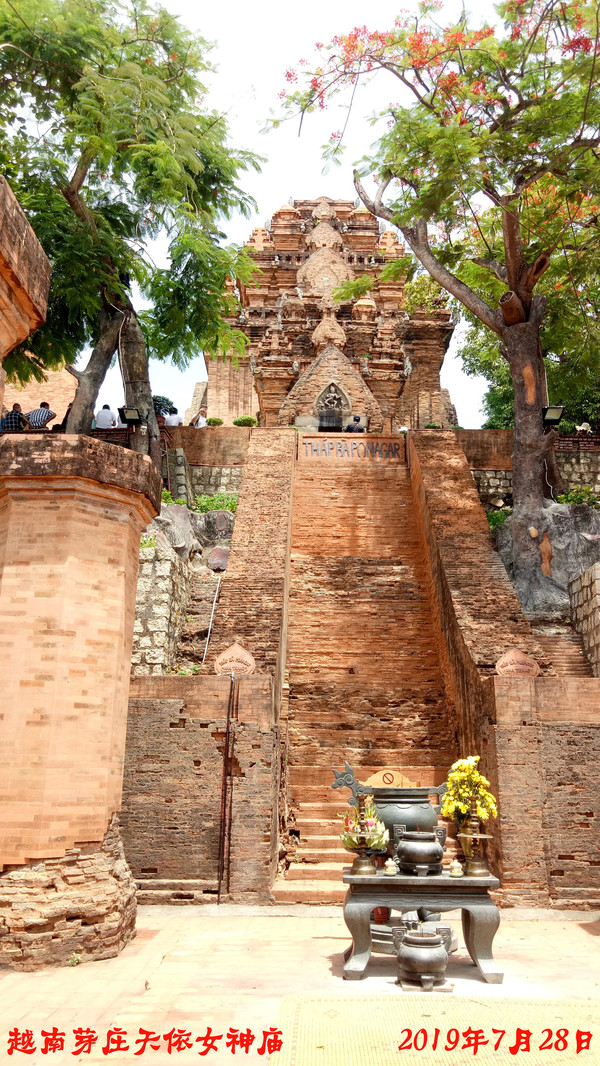 7月28日早上10点酒店退房后前往天依女神庙+五指岩,天依女神庙钟,当地人又称此庙为婆那加,这里有几栋魏峨的宝塔,据说在 7 至 12 世纪此地共有 8 座宝塔,现只剩 4 座,其中最大的主塔内供奉占婆女神,她是古时候统治芽庄的占婆王国之母,印度教徒称占婆女神是印度教希瓦神(Siva)的