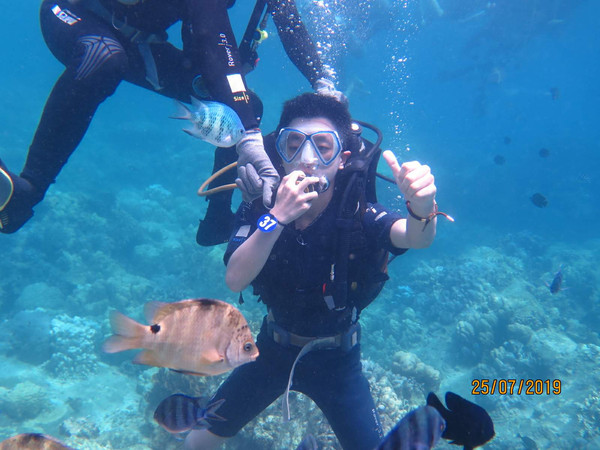 1个小时后都在问还有好久到?回去时能不能改成快艇?再经过10多分钟后到达一个潜水浮船,儿子和一对新婚夫妇还有一个初中生女孩上去潜水,其余人员继续开往旁边小岛上岸游玩,大概1个小时