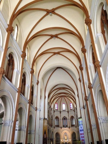 这个位于整个胡志明市最中心的教堂建于1877年至1883年间,是天主教胡志明市总教区的主教堂,典型的哥特式建筑,是胡志明市标志性建筑之一。教堂的两座40米的钟楼仿照巴黎圣母院的设计,所有的原材料皆来源法国,外墙的砖来自马赛,因此历经一百多年之久,红砖丝毫没有褪色,所以这个圣母教堂还被称作“红教堂”。教堂前伫立着圣母玛利亚的雕像是1945年罗马教会相赠的礼物。很美的一座教堂,是仿照巴黎圣母院制造的,最特别的地方就是,一钻一瓦都是从法国运送过来的,所以特别有法国气息。
