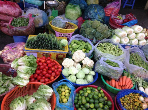 集贸市场上的蔬菜, 新鲜且便宜, 在老挝和柬埔寨见到的不多