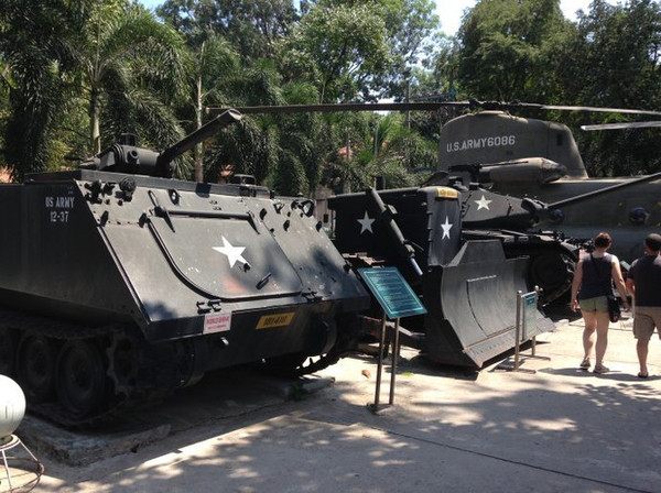 门前停放着当年美军的军备,包括战机、直升机、坦克和火炮