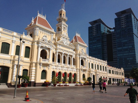 胡志明市委员会大厅于1908年竣工,建筑风格受法国风格影响,整个市政厅只有两层,除了屋顶的红色,市政厅大楼只有黄白两色,但外墙、门框和屋檐等部位布满了以法国英雄人物为题材的浮雕,精致而不失简约。
