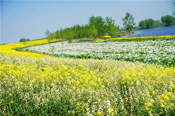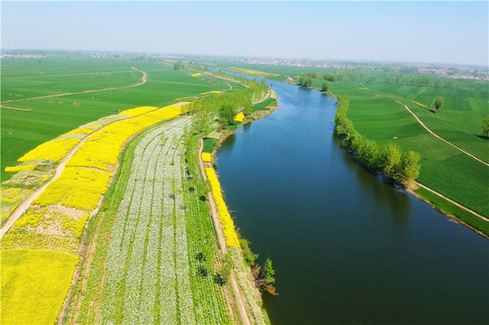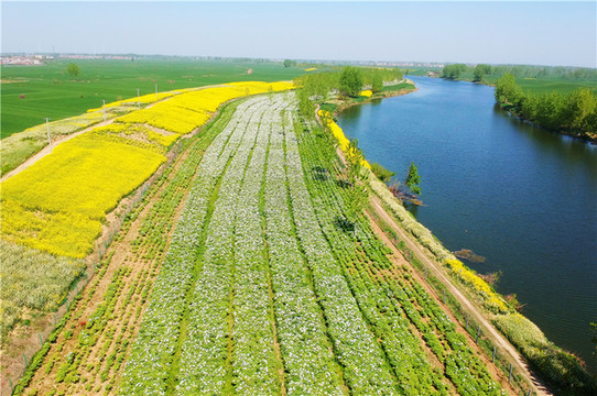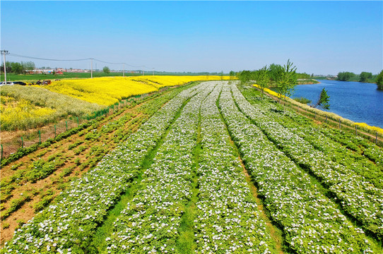 一弯碧水悠悠,河两岸色彩丰富,这里是安徽宿州泗县的慧佳农业生态园,位于安徽宿州泗城镇西部、汴河大道与G104 国道交界处,尽情怒放的牡丹花、油菜花,和抽穗的小麦,黄色、白色、绿色相交织,一直绵延向远方,赏花踏青,是春天最美好的事情。