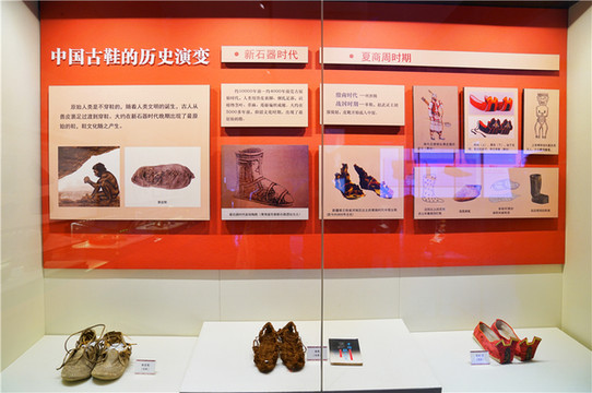 鞋子的发展历史也跟人类的发展历史息息相关,从茹毛饮血时代进入文明社会,鞋子的外形和款式,也发生了翻天覆地的变化,不同的年代,鞋子有着鲜明的时代特征,比如说 新石器时期是人类的彩陶时代,大量彩陶反映了那时候人们的生活。在古鞋博物馆,我们看到尖头陶靴上的纹样有两种解释,一是先人们曾纹身为衣,有了鞋后,常把足踝上的纹样装饰到彩陶制品上, 二是彩陶工艺将编织鞋的纤维编织纹路和捆绑系绳形状绘于鞋面上,这样具有时代特征的鞋子,对于历史学家研究历史也有很大的帮助。