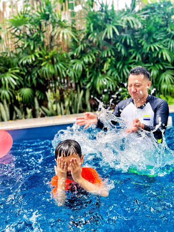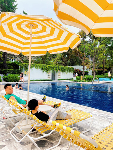 泳池:我们这一栋是离酒店公共泳池最近的一栋别墅,所以乐哥每天在小泳池玩耍完,披上浴巾直接去大泳池继续找乐子。泳池旁柠檬黄心的太阳伞和沙滩椅都超时尚,随手一拍都是满满的度假风。所以,整个酒店上午的日照是非常美的,宛若一个超美的热带雨林!
