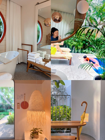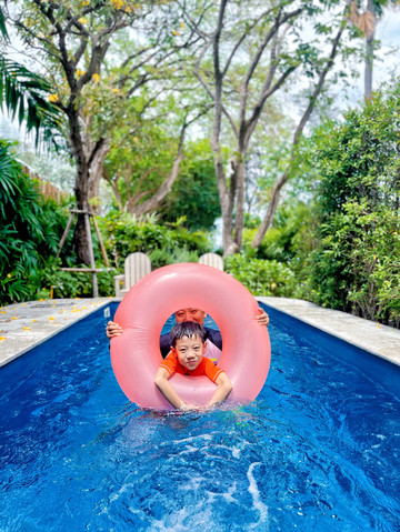 房间里的装饰漂亮、简约又不失可爱,选用木质材质的床头装饰和沙发搭配,再加上柠檬黄的点缀让整个别墅都充满小清新的感觉。欢迎礼遇满满惊喜,两个新鲜的大椰子、还有几袋酒店自制的点心。独立的浴缸配上disco ball ,增添一些叛逆酷玩的元素。圆形镜子太戳乐妈少女心了!乐哥超爱这里的mini 泳池,也是我们仨的快乐时光。