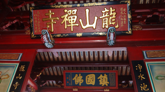 寺中还有多处名人墨迹,有南宋理学家朱熹题写的“普现殿”、明代大学士、书法家张瑞图题写的“通身手眼”、明万历进士苏琰题写的“龙山宝地”,弘一法师题写的“绍隆佛种”、宰相李文祯题,举人柯琮璜书写的“镇国佛”,还有清道光翰林庄俊元真迹门联“为甚十二个时辰憎枷爱纽尘缘不断,果然五百双手眼溺拯扶危佛法无边”,清福建陆路提督蓝理题写的“南海行宫”,以及赵朴初先生题写“龙山寺”匾额。