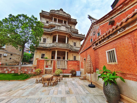 曾经蕴藏着无数家族奋飞的梦想,也曾让多少出外打拼的人梦绕情牵。阳光洒在砖墙上,屋脊倒影在石面,红白相间的外墙立面,纵横着岁月留下的沧桑。