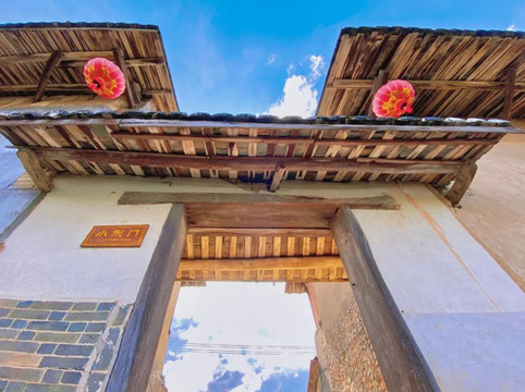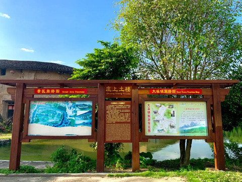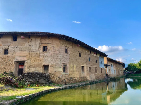 走进庄上土楼的门前是大池,和很多客家土楼一样,门口设池塘,符合风水规律,这是客家建筑的一大特点。人站立在土楼外,看到的是碧绿池水、蔚蓝天空,远处的灵通山诸峰高高低低,恰似一青翠叠嶂。面对此景,作为游客的我真的陶醉了!