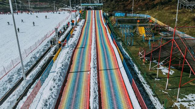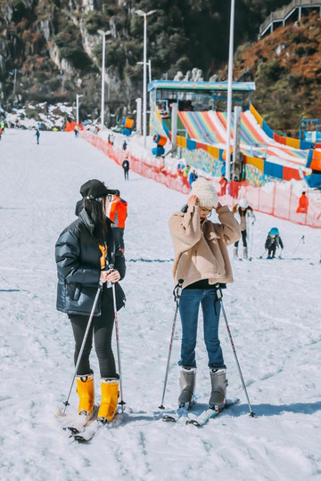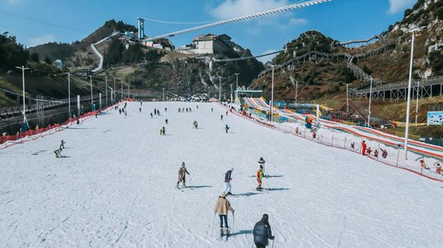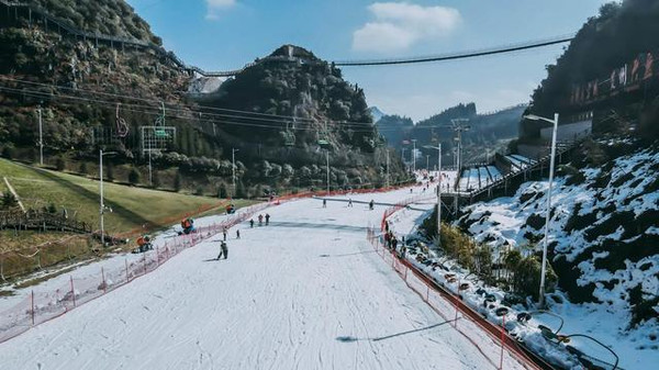 梅花山国际滑雪场位于六盘水梅花山国际生态休闲旅游度假区,距离市区仅有10公里路程。雪道占地面积9.17万平方米,总长1880米,分为高、中、初三级赛道,此外,滑雪场内还配备有双人吊椅索道缆车、雪地魔毯输送机等设备,可同时满足5000人的滑雪需求。目前对游客仅开放两段初级赛道,单双板、雪胎、彩虹滑道也可以满足不同年龄段玩雪需求。