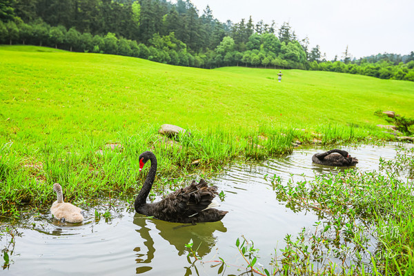 大草坪中间还有蜿蜒的小溪,天鹅一家正悠闲地戏水。小天鹅宝宝好可爱啊!