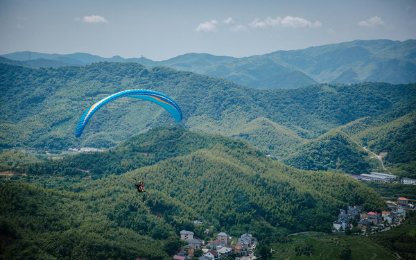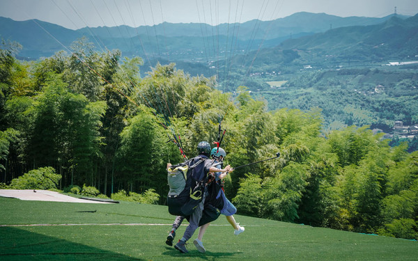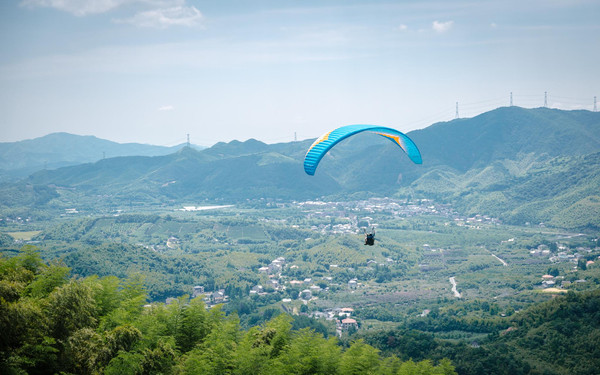 适应了一会,你就可以慢速、轻柔、自由自在地悬浮于空中了,在数百米的高空中换个角度看世界,扑面而来的凉爽清风畅快呼吸新鲜空气,全身心的毛孔也都变得舒畅,听风的呼吸,看云的舞蹈,似乎所有的烦恼瞬间被山顶的绿意驱散~