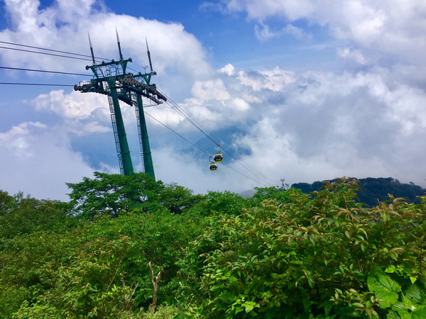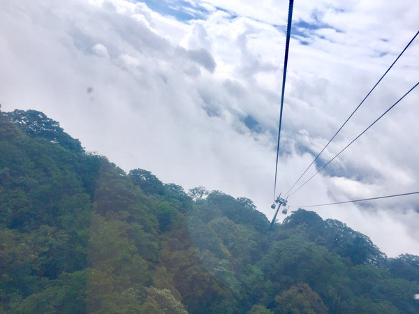 差不多半小时左右,到达徒步登山上道口或者索道上道口,本意是计划全程徒步上山——网上说体力充实4小时左右即可到达缆车下道口,心想实地体验,可拗不过天气不配合,灰蒙蒙的小雨一直在下着,同时半山环绕着大雾!相互商量后,果断缆车上道,放弃那最初的体验计划!也许这就是印证了那句旅行途中无可或缺的遗憾罢了!!
