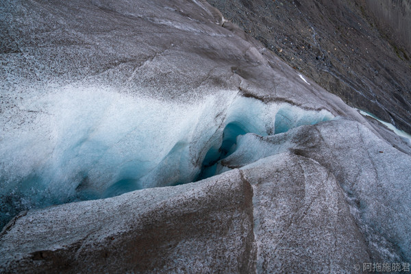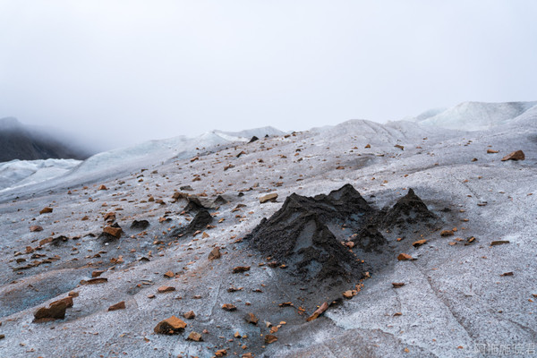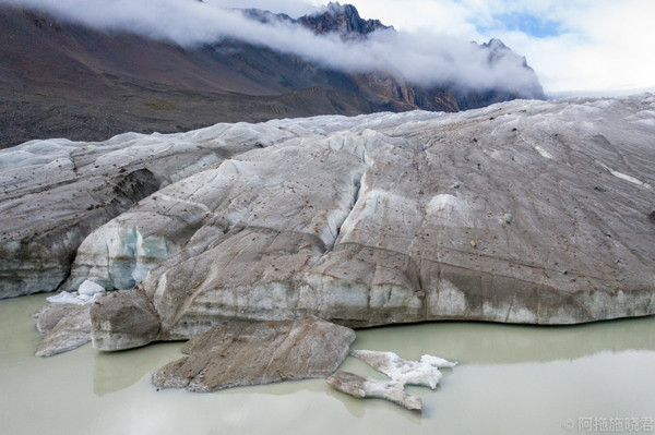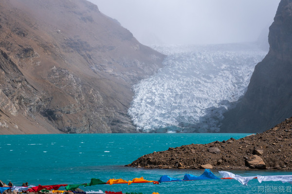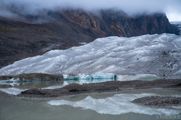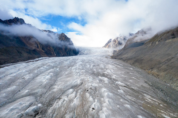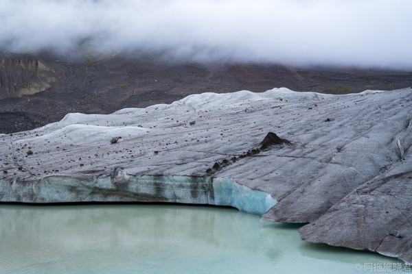 冰川上有许许多多的灰尘和碎石渣,它的身旁就是巨大的山体,看起来灰蒙蒙的,可是也不失它的美。如果想要看到雪白的冰川,自然是要在冬天来,那会冰湖大多都冻成了冰面,可以直接行走在上面来亲近冰川。