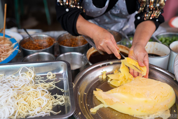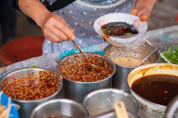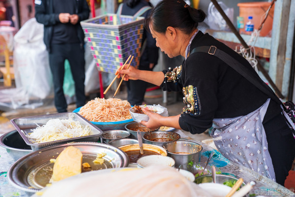 阿嬷拿着手中的菜询问着路过的人们买不买,行走的摊位大概就是这样的了。大姐正在制作豌豆凉粉,先试将不同形状的凉粉搭配米线和面条,再重新做一份蘸料,有熬好的辣椒酱,腌好的萝卜丝,再加上一点香菜和葱。