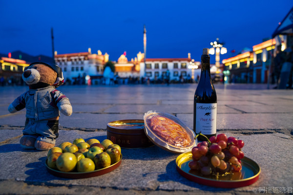 这次旅途出发前我们就带上了月饼,在平措康桑顶楼吃完晚餐,突发奇想,带上月饼去大昭寺广场吃。当然了,这根本是不被允许的,才刚刚摆好了红酒配月饼,就立马被赶了,我们也只能悻悻地离开,回客栈吃月饼了早点歇息了。