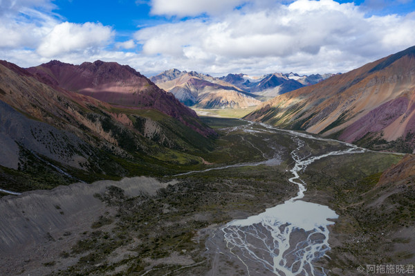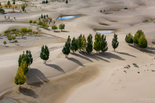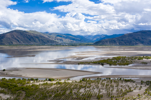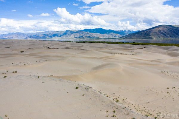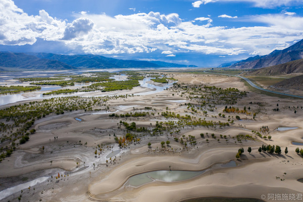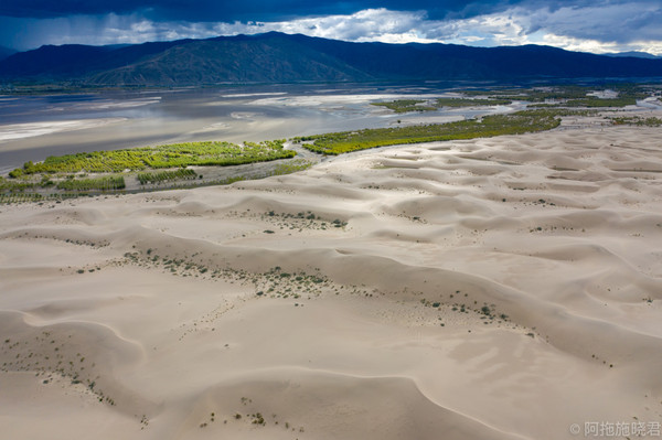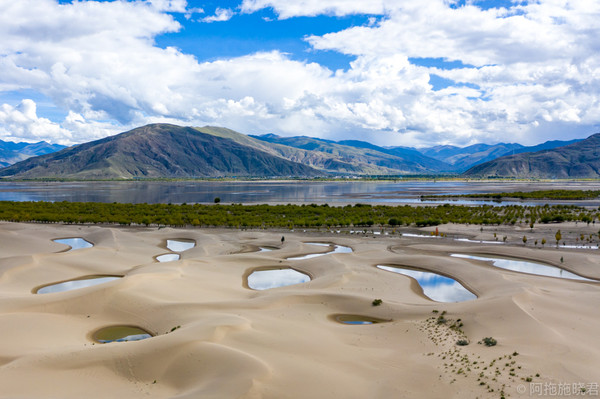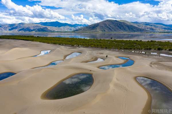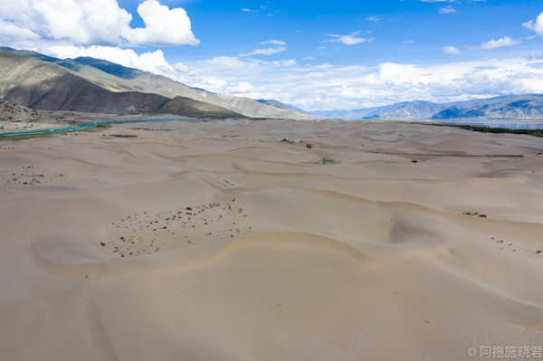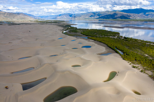 因为扎囊沙漠紧挨着河道,地下水补给充足,它就不像大 西北 的沙漠那般干旱,我的无人机飞上去甚至还有一潭一潭的清水,还能有点儿树在边上。