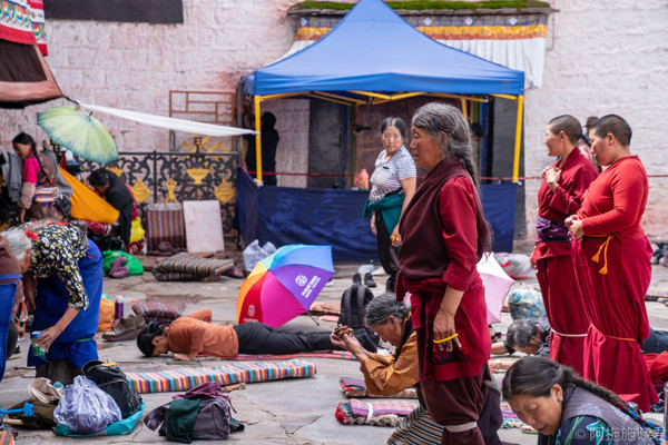 女人们,穿着传统的藏服,长裙拖地,为了防止冷风灌入,用绳子捆绑裤脚。手掌合十,高举过顶,屈膝伏地,抬头仰望,仰望这二十一世纪初期的 拉萨 。起起落落,衣袖、膝盖的皮质、手中的铁板就这样慢慢磨平。世界一直在变,他们眼中的神色从未改变,眼神如同酥油灯,泛着沉寂而温和的光芒,平静而炽热,带着原始的渴望,深不见底。”