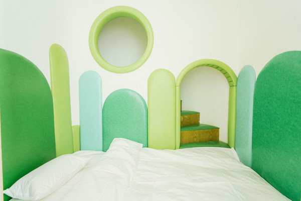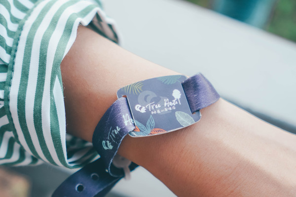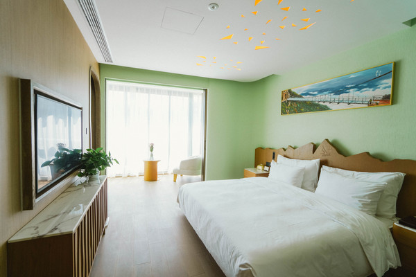 客房门卡很有特色,是个绑带手环,房间整体配色为绿色,扑面而来的田园自然感,仿佛一下子拥抱了清爽夏天,透过180°全景大窗户,可以看到外面的山野景色。