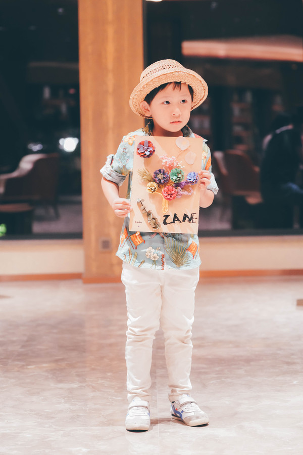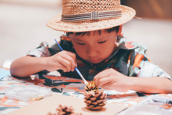 酒店不时会有一些亲子手作活动,我们赶上了晚上8点的DIY松果画,现场提供材料和画笔颜料,参与容易。