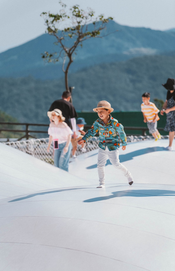 童心谷丰富的游乐设施让大小朋友流连忘返,设计巧妙,充满童趣,云朵形状的蹦床“蹦蹦云”洁白柔软,蹦在上面仿佛置身云端,就像在白色的云朵间跳来跳去,让元宝和涵涵开心的无所适从。