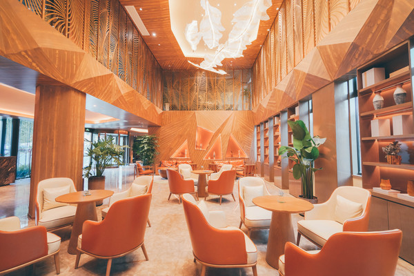 大厅设计也颇有特色,几何造型简约而富有艺术气息,金色的树叶吊灯美观雅致。