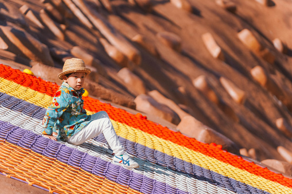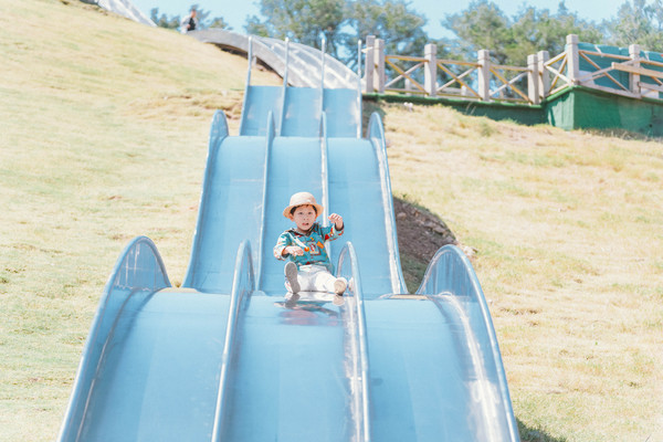 从20多米的高处飞跃而下,欢乐又刺激,可惜彩虹滑草有身高限制,要1.4米以上才能玩,让元宝和涵涵望而兴叹。