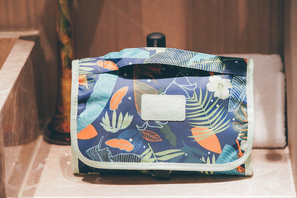 洗手间的墙上有着可爱的小松鼠彩画,非常可爱,最好评的是洗漱包,很是精致,东西齐全的超乎想象,不仅有常见的洗嗽6件套,还有发带、面膜、一次性毛巾等等,牙膏是ora2,洗发水什么的是资生堂,关键是整个洗漱包都能带走,精美伴手礼的颜值与质感,我们此行每个人都对其赞不绝口。