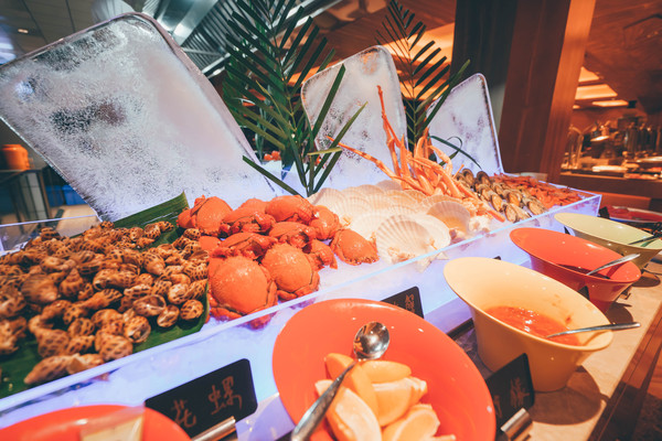 自助晚餐有老虎蟹、雪蟹蟹脚、扇贝、海虹等等,炒菜和甜品都很丰盛,还可以现场让排挡师傅做烤鱿鱼、烤黄鱼、烤羊排等等,品种丰盛堪比五星,服务人员的工作服很有特色,颇具少数民族风情。