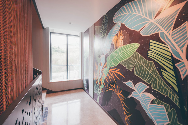 我们入住的是竹径通幽绿野奇遇房,位于12号楼,细看便能发现萌趣的小松鼠是酒店的一大特色,不仅楼层用小松鼠造型标识,楼道走廊里也有松鼠藏匿森林的大幅彩画。