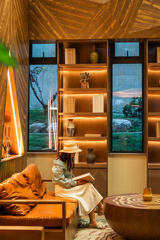 博古架里放置着各种摆设和书籍,营造出一个静谧的度假氛围。