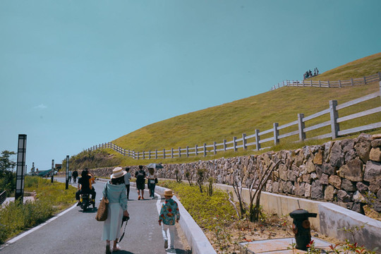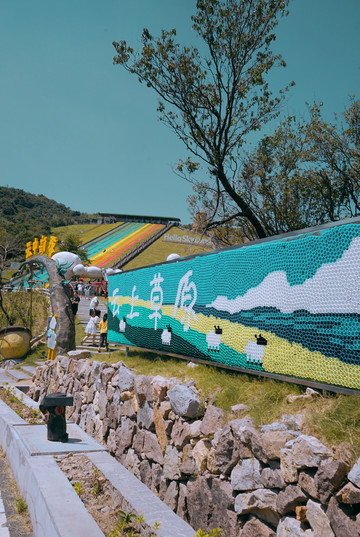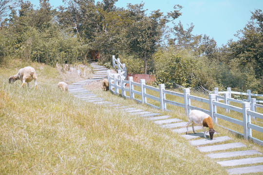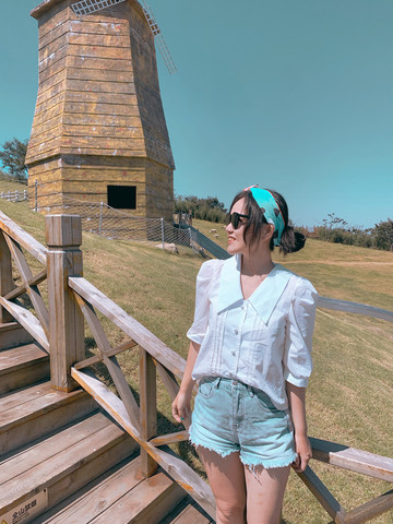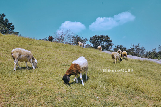 一眼看到一片牧场田园风光,爬上小山坡,白色的栏杆和风车,一群羊咩咩在草地上悠闲吃草,那感觉就好像在欧洲的田园一般,超级出片的地方!