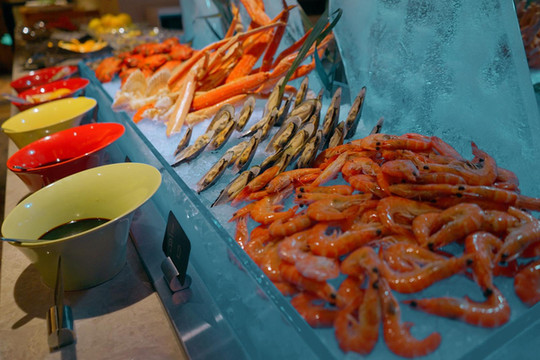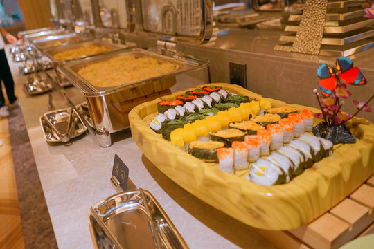 然后我们还去吃了酒店的自助餐,在三楼,环境很高档大气,菜品丰富多样,从海鲜、肉类到中西式餐点、精致甜品、鲜榨饮品等应有尽有,9月30日前入住酒店就可以免费享用当日自助晚餐及隔日早餐。